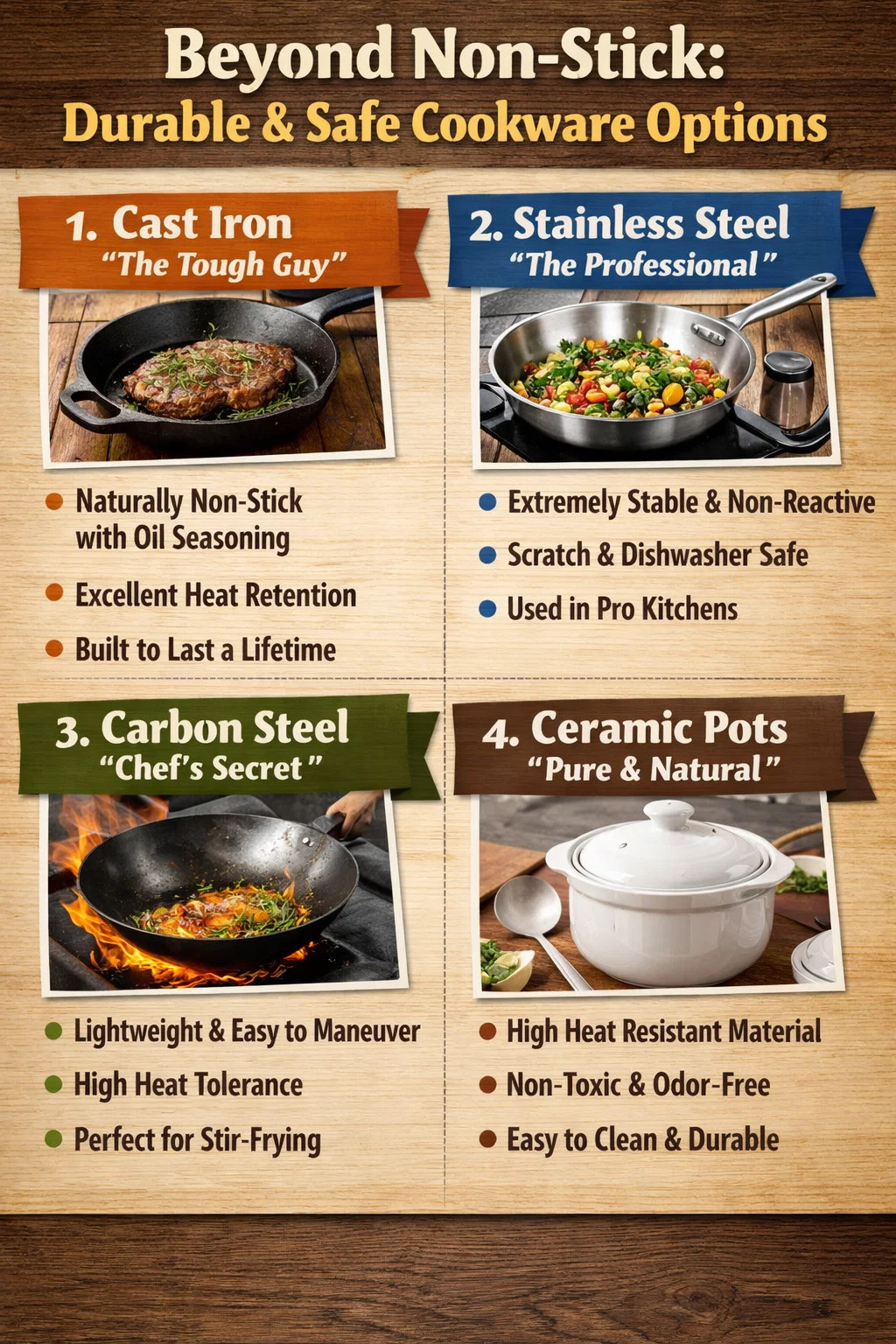 Embora moderno panelas antiaderentes é seguro sob uso normal, se você estiver procurando por utensílios de cozinha totalmente livres de preocupações, sem preocupações com descamação do revestimento ou problemas de alta temperatura, existem de fato várias alternativas mais robustas e confiáveis.