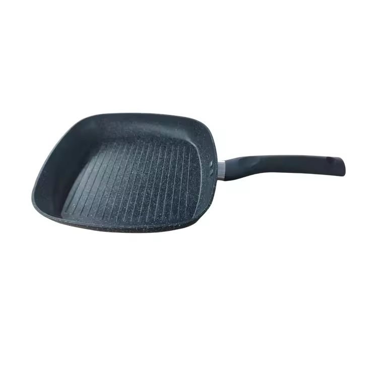 Grelha antiaderente de alumínio fundido, quadrada, toque macio, alça fria, revestimento livre de PFOA, compatível com indução